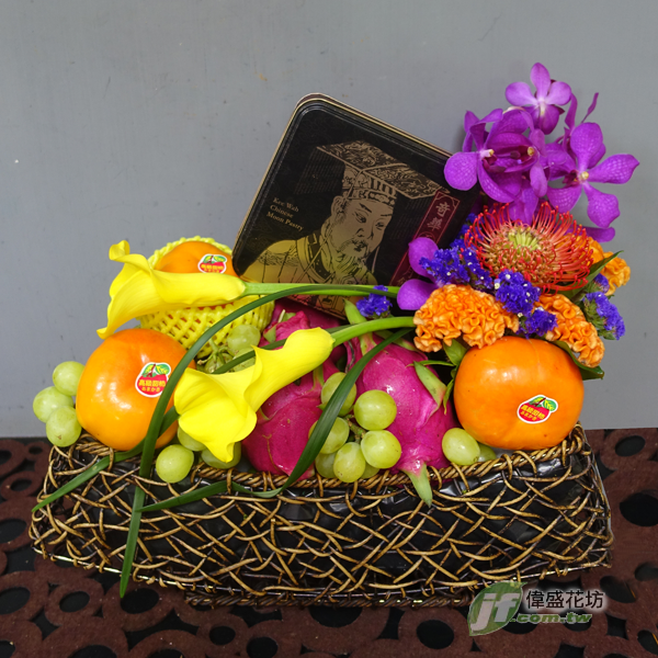 當季水果、禮餅、海芋、雞冠花、針墊花、千代蘭
